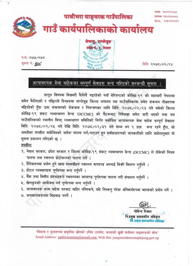 अत्यावश्यक सेवा बाहेकका सम्पुर्ण सेवाहरु बन्द गरिएको सम्बन्धमा