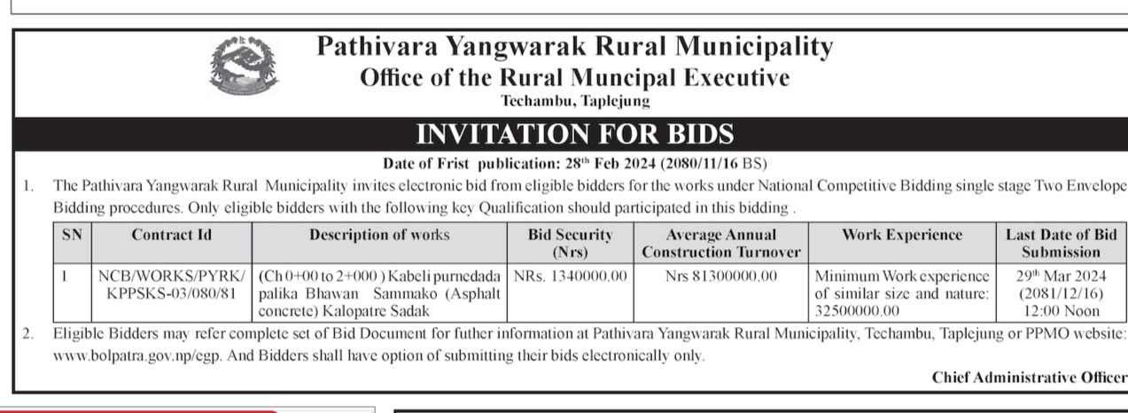 Invitation for Bids (Kabeli Purnedada Sadak Kalopatre)