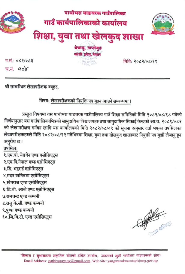 लेखा परीक्षकको नियुक्तिपत्र बुझ्न आउने सम्बन्धमा।
