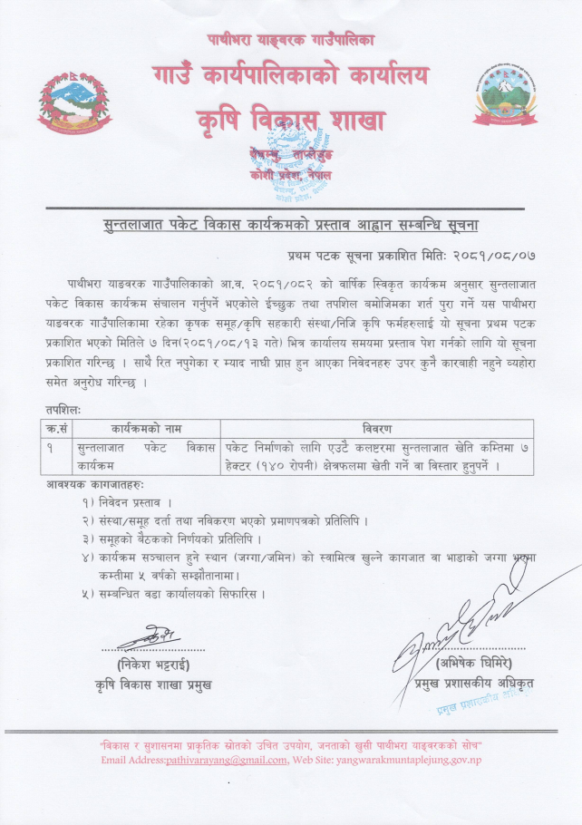 सुन्तलाजात पकेट विकास कार्यक्रमको प्रस्ताव आव्हान सम्बन्धि सूचना ।