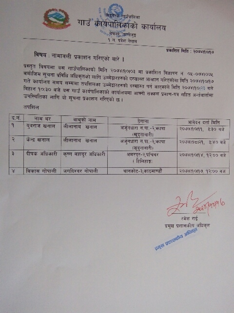 प्रस्तुत सम्बन्धमा यस गाउँपालिकाको चालू आ.व. २०७४/७५ को दोस्रो चेोमासिक (फाल्गुण महिनासम्मको) खर्चको फाँटवारी जानकारीका लागी प्रकाशन गरिएको व्यहोरा जानकारी गराईन्छ।
