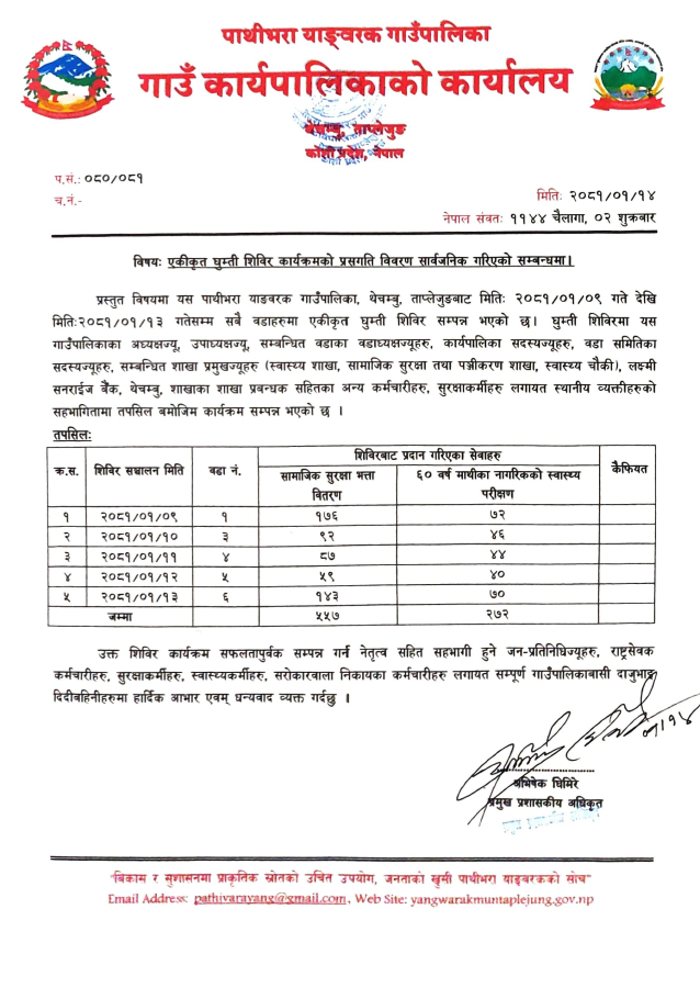 एकीकृत घुम्ती शिवर कार्यक्रमको प्रगति विवरण सार्वजनिक गरिएको सम्बन्धमा
