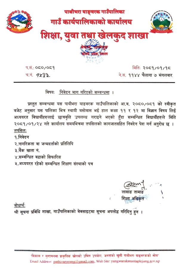 छात्रवृत्तिको लागि निवेदन माग गरिएको सम्बन्धमा।